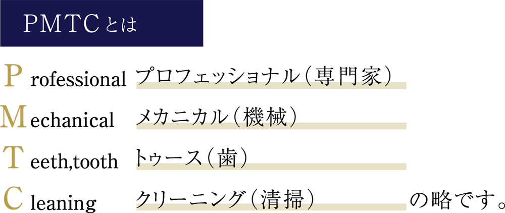 PTMCとは「P:プロフェッショナル(専門家)」「M:メカニカル(機械)」「T:ティース(歯)」「C:クリーニング(清掃)」の略で、日々の歯磨き では落ちない汚れを、歯科医・歯科衛生などが専用機器を用いて行うクリーニングのことです。